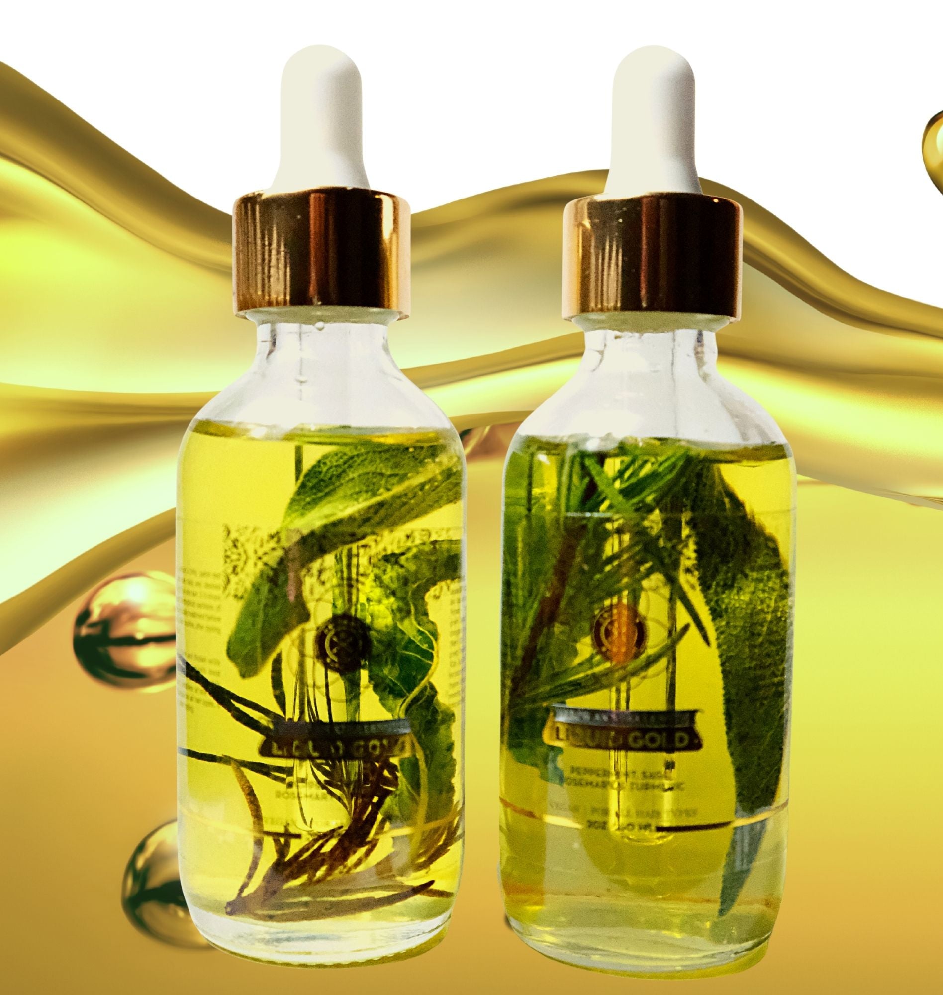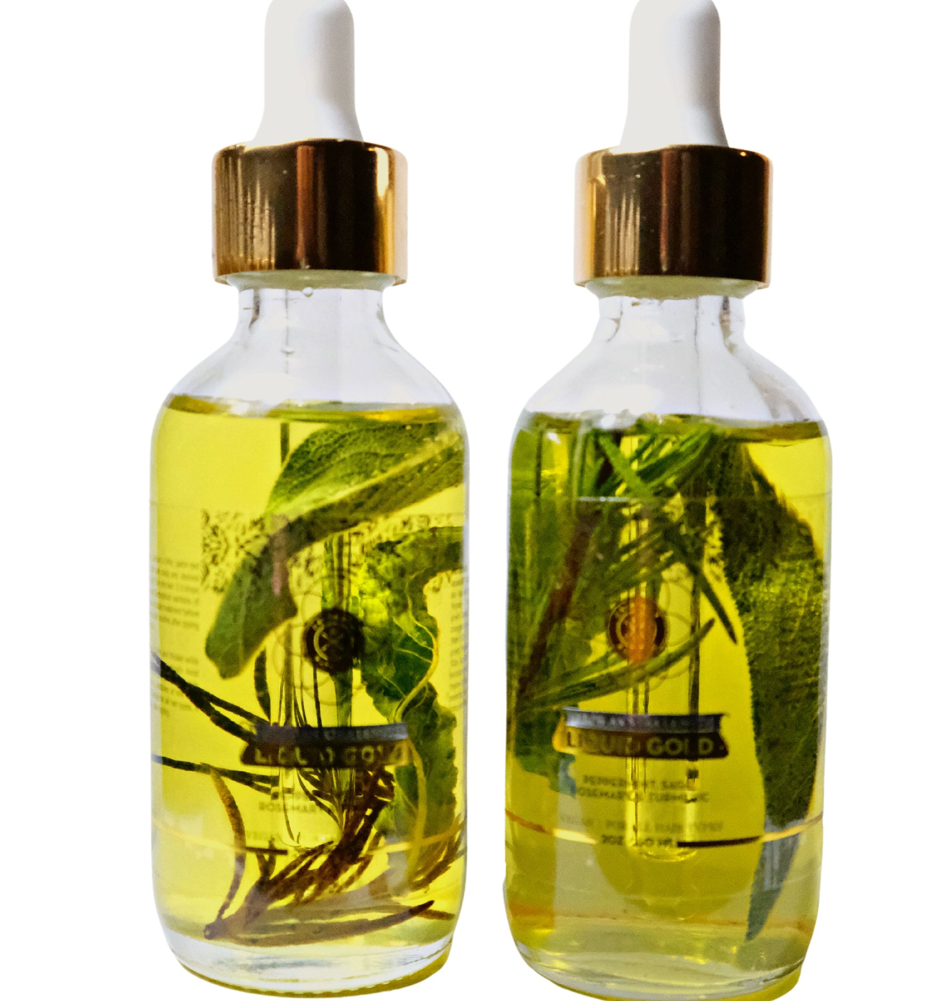 Our hair growth oil comes packaged in a stunning Gold 2 oz. clear dropper bottle, making it easy to apply and perfect for on-the-go use. This luxurious formula contains a unique blend of natural ingredients, including Jojoba Oil, Castor Oil, Vitamin E, Biotin, Peppermint, Rosemary, Clary Sage, and Turmeric, as well as dried herbs that seep into the oil, further enhancing its nourishing properties. This powerful formula has been proven effective in promoting hair growth and combating hair loss caused by various conditions. Try our liquid gold hair growth oil today and experience the ultimate solution for healthy, luscious hair.