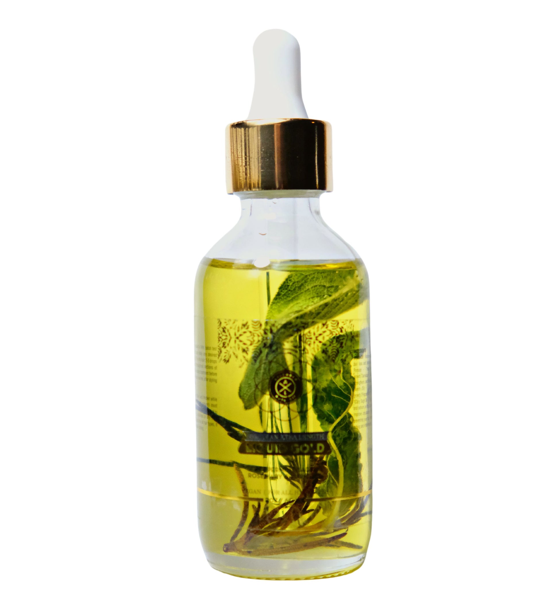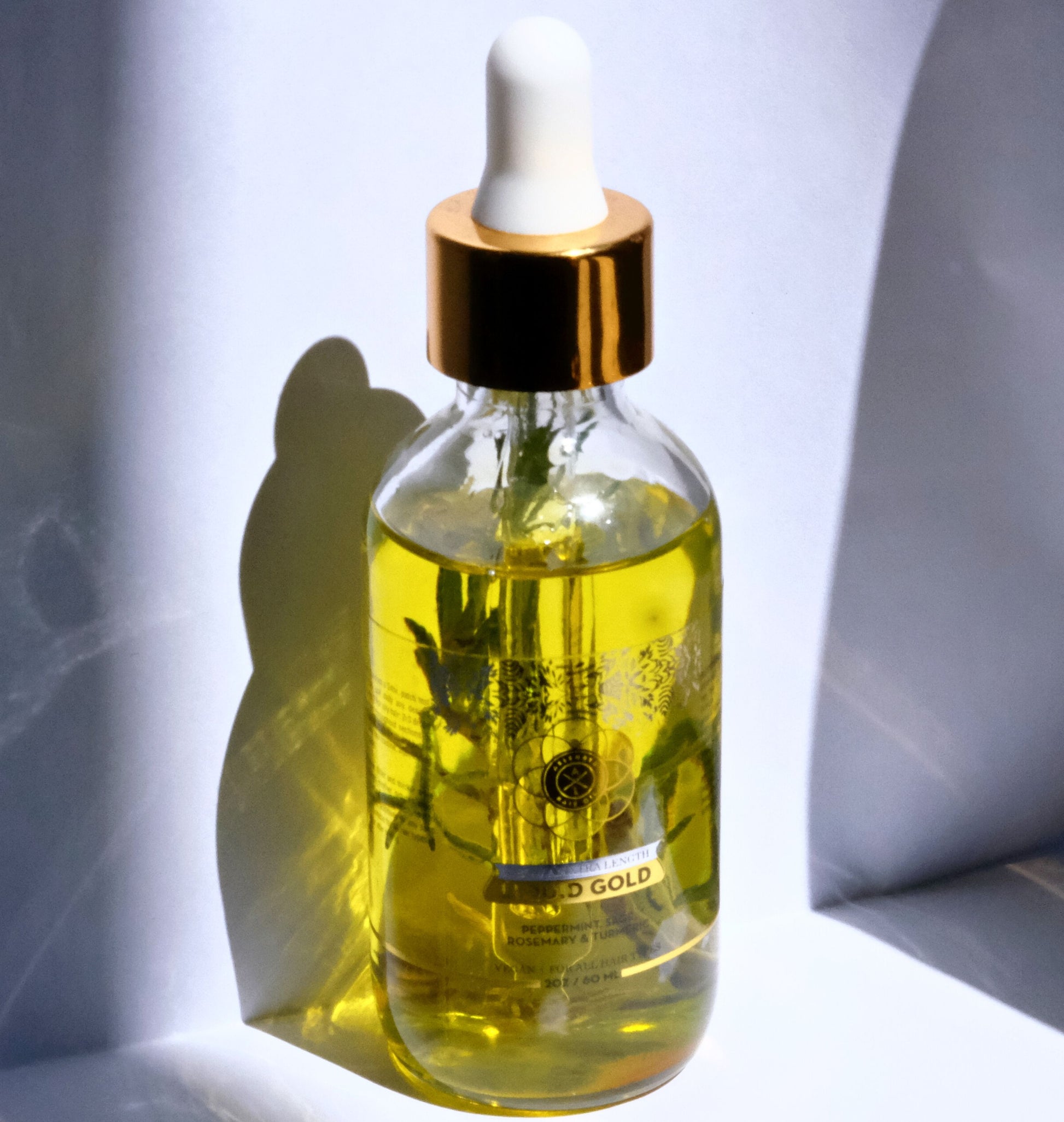 Our hair growth oil comes packaged in a stunning Gold 2 oz. clear dropper bottle, making it easy to apply and perfect for on-the-go use. This luxurious formula contains a unique blend of natural ingredients, including Jojoba Oil, Castor Oil, Vitamin E, Biotin, Peppermint, Rosemary, Clary Sage, and Turmeric, as well as dried herbs that seep into the oil, further enhancing its nourishing properties. This powerful formula has been proven effective in promoting hair growth and combating hair loss caused by various conditions. Try our liquid gold hair growth oil today and experience the ultimate solution for healthy, luscious hair.